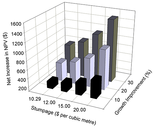 ![]() Fig. 3. The economic value of increased growth rates as indicated by the net increase in the net present value (NPV) of revenue at harvest in multiple-rotation eucalypt plantations in south-western Australia. |
