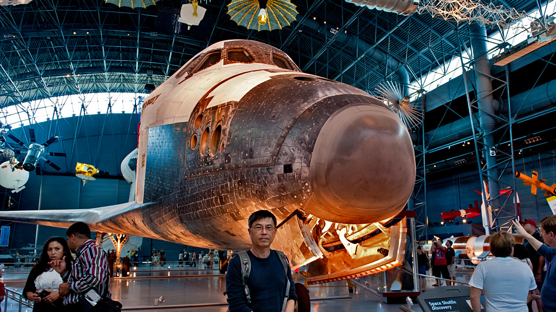 In front of the space shuttle Discovery in the James S. McDonnell Hanger.