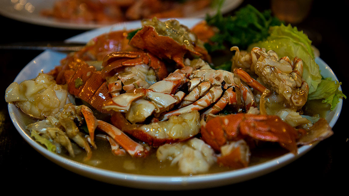 Local crayfish (called "lobster") stir-fried Hong Kong style at Dragon Seafood restaurant, Bakam Road, Miri