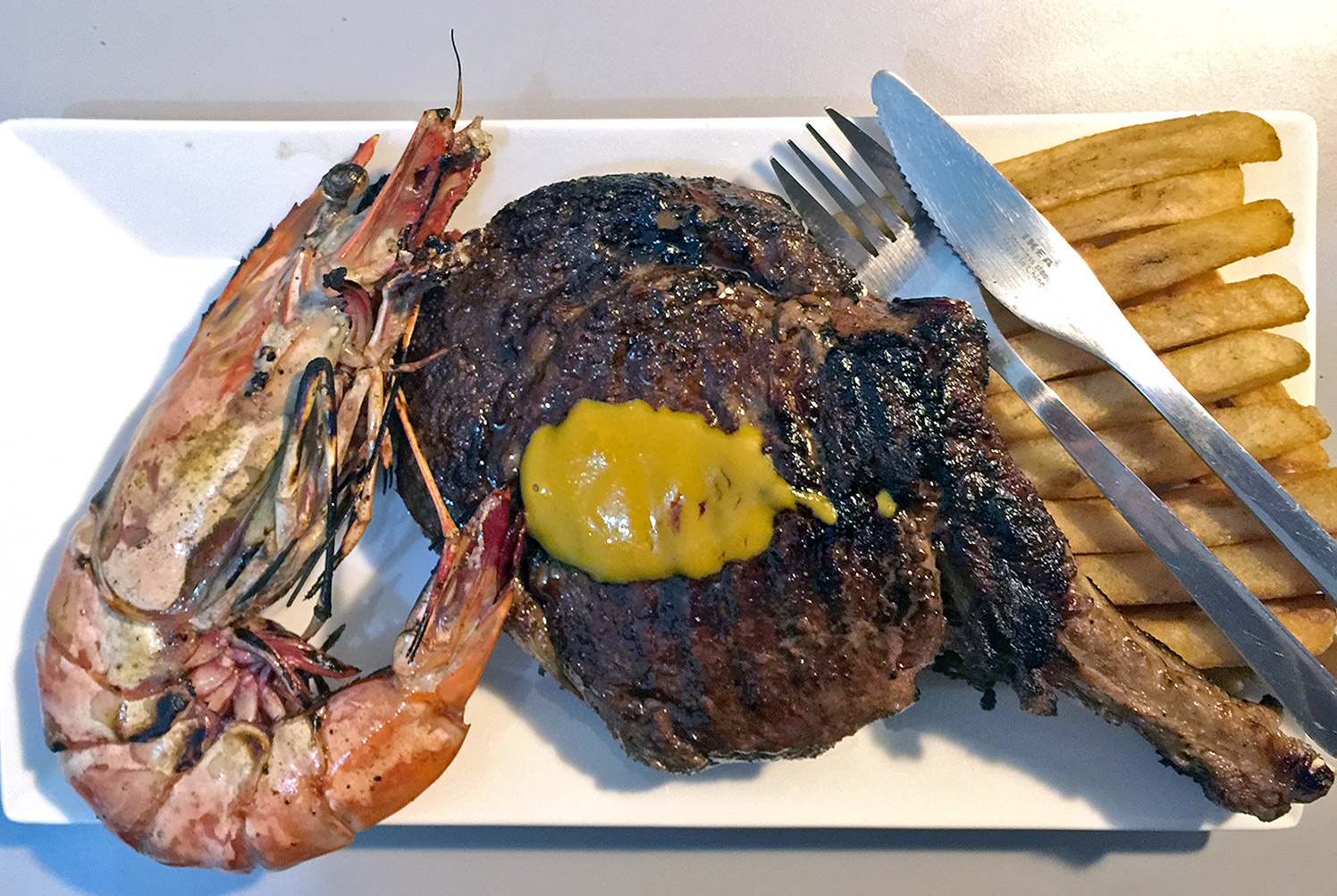Clem prepares his surf and turf Local giant Tiger prawn (Panaeus monodon) and NZ airflown chilled Angus ribsteak on the bone (0.76 kg) singed with a culinary blowtorch