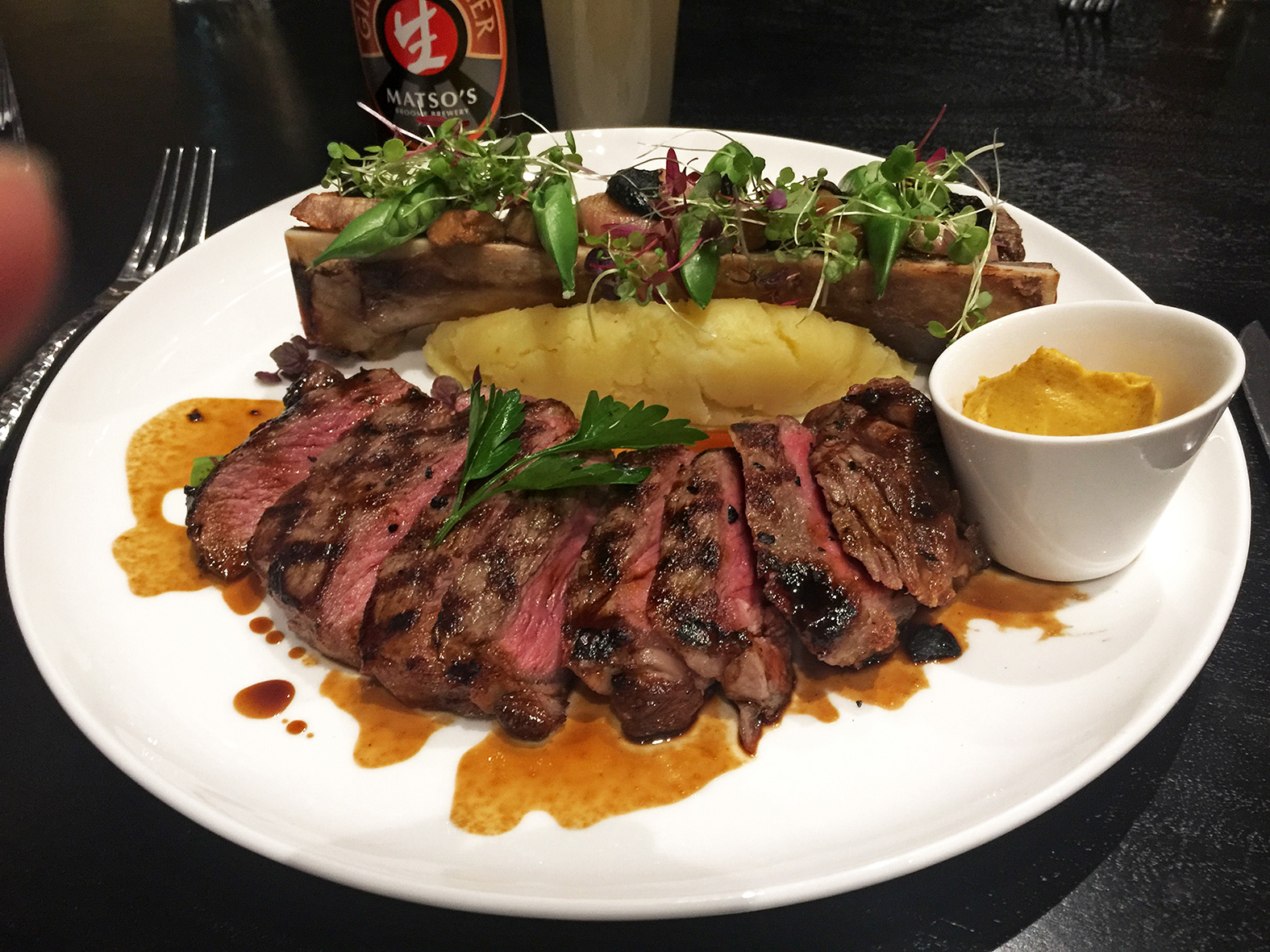 With eschallots, baby king mushroom, black garlic, peas, creamed royal blue potato and marrow bone.