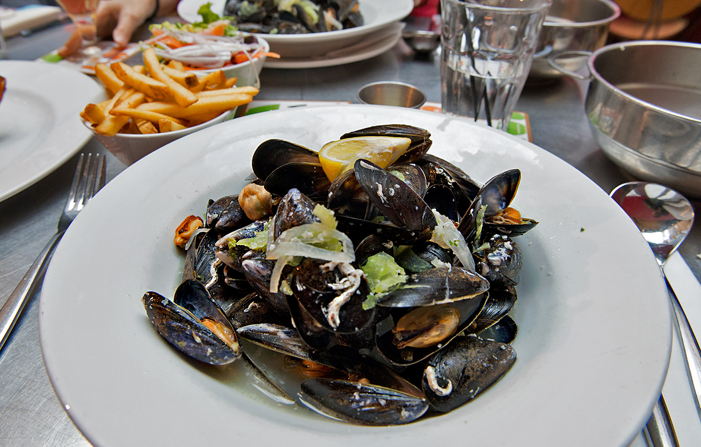 Moules traditionelle et frites £7.50 Mon to Fri lunch time otherwise £13.50 per pot