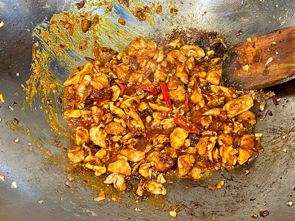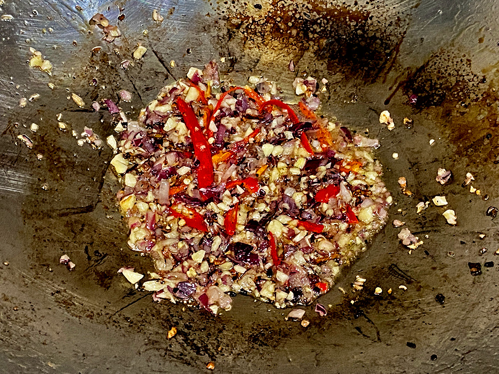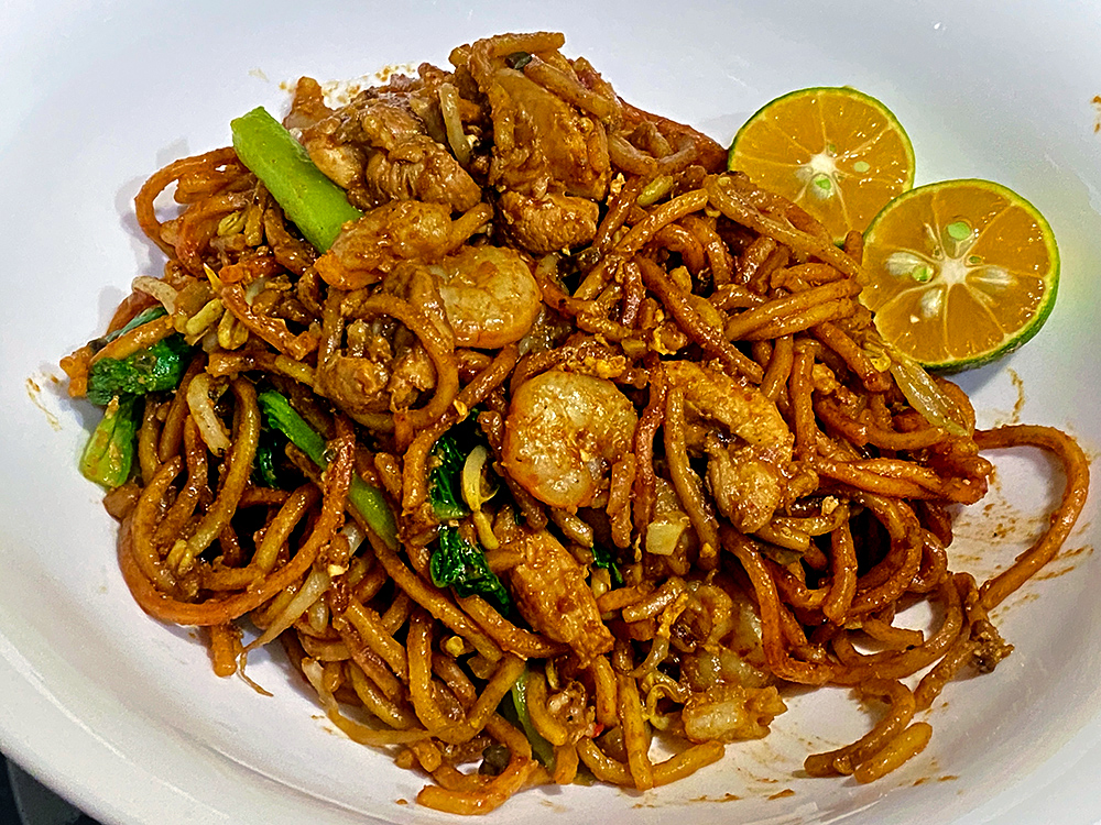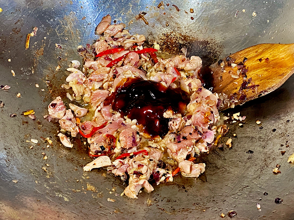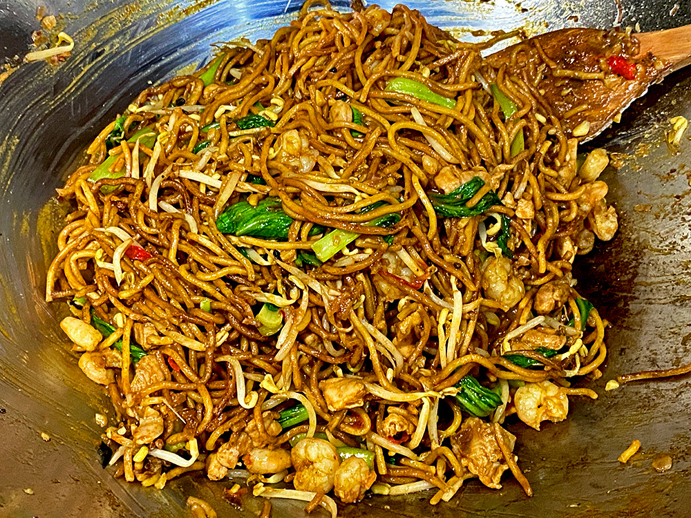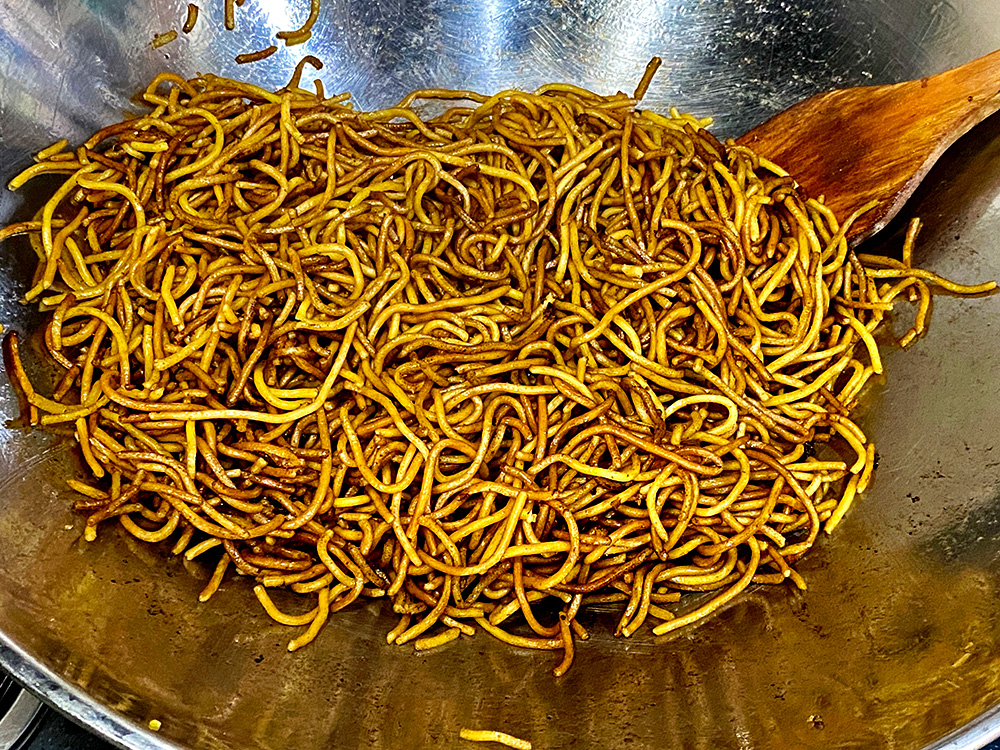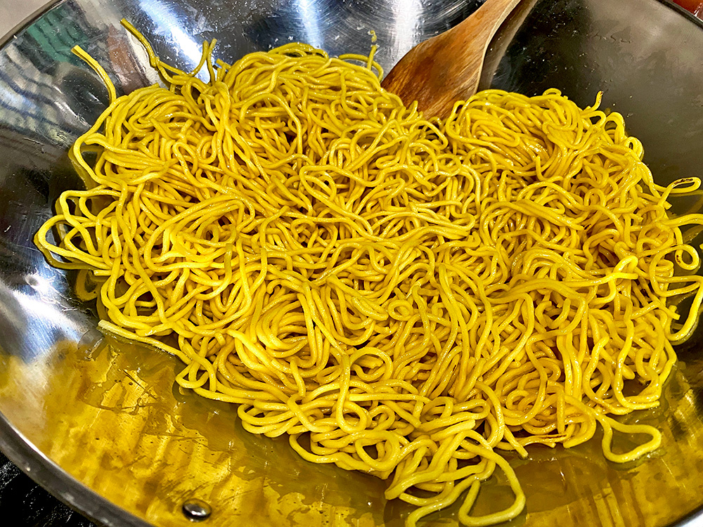 wok; crack some eggs (two or more) and mix into the noodles; fry