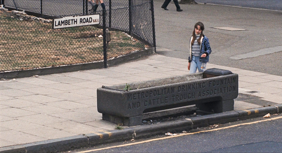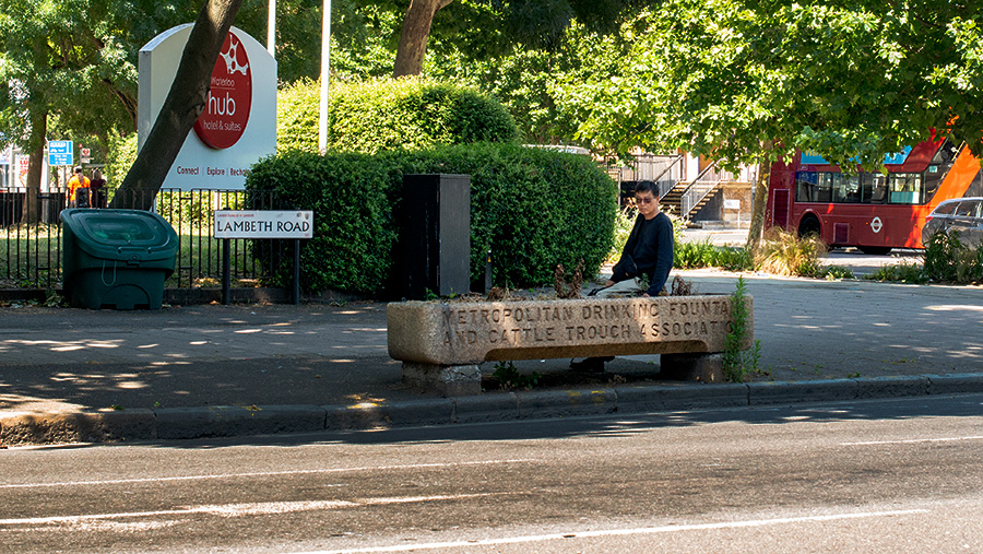 walks along Kennington and Lambeth Roads. She eventually stops by a water trough to let