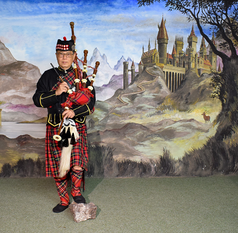 The Royal Mile, Edinburgh; 02 July 2022 Dress-up studio picture taken at the Tartan Weaving Mill
