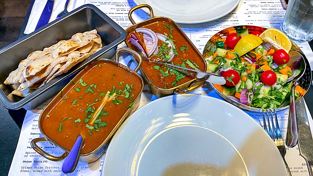 £3), Bombay Chicken Curry (left; £11),  Muglai Kadhai Lamb (middle; £12), and kachumba salad  (right; £2.5)