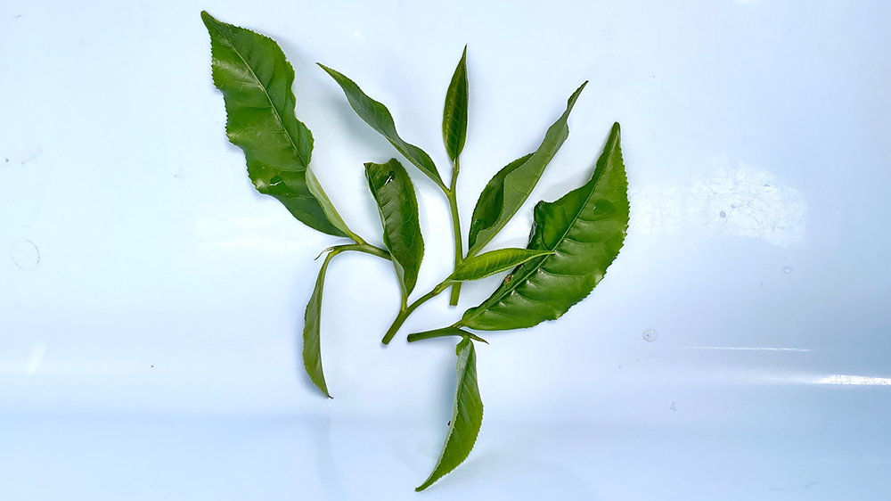freshly plucked at Mayang Tea as would be used to make tea. These shoots preferably should be the first two leaves and a bud. However, buds are not evident here.