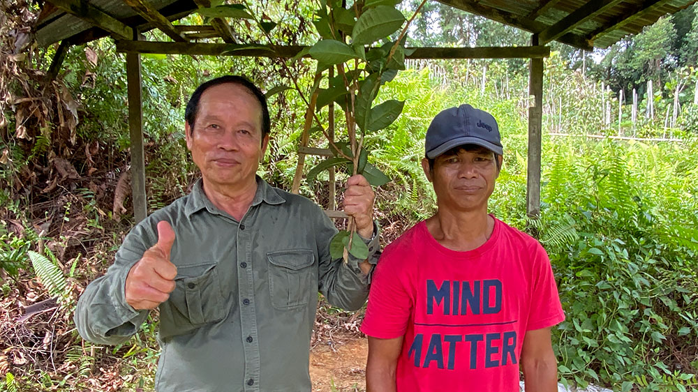 Dr Stephen and farmer Buni. Stephen holds the tea branches which he had cut for us to take home