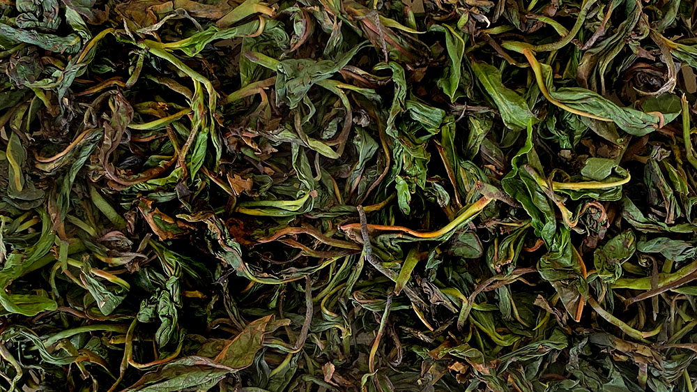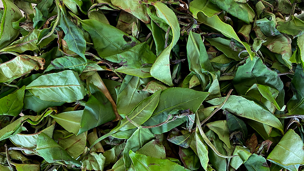 After withering, the leaves were hand rolled for some 30 minutes. The leaves can be seen to be crushed