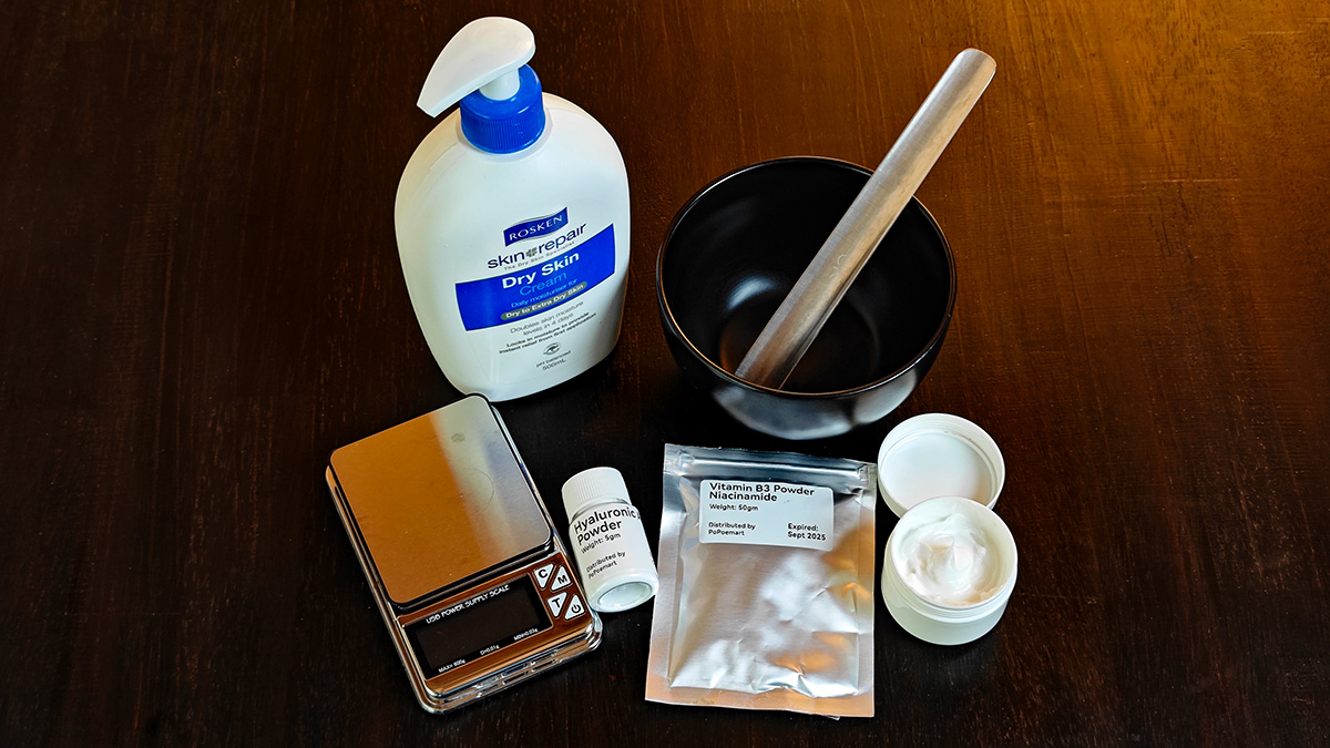 L-R: A digital balance to 2 decimal places; Skin Repair cream; hyaluronic acid powder; Niacinamide powder; mixing bowl; cream jar
